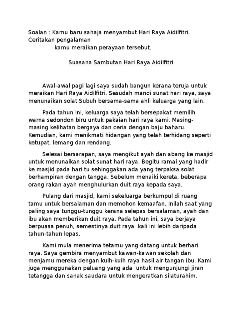 Hari raya aidilfitri disambut umat islam setahun sekali selepas mengerjakan ibadat puasa wajib bulan ramadan. Tuliskan catatan kamu pada hari tersebut. Contoh karangan pengalaman semasa cuti sekolah pt3.